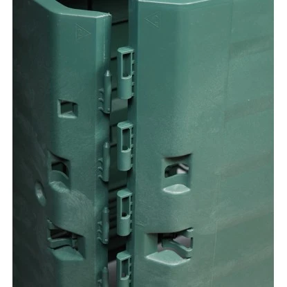 Dank eines einfachen Stecksystems können Sie den aus Kunststoff bestehenden Thermokomposter unkompliziert und ohne Werkzeug zusammenbauen. Die Befüllung erfolgt bequem durch zwei große Einfüllklappen an der Oberseite des Komposters. Mithilfe einer seitlichen Klappe können Sie die fertige Komposterde entnehmen. Die Deckelarretierung des Thermo-King 900 l dient zur Regulierung der Luftzirkulation und der Windsicherung. Dadurch können Sie den Komposter ganzjährig nutzen. Der Komposter besitzt keine Bodenplatte (separat erhältlich), da der Bodenkontakt für den Verrottungsprozess notwendig ist.