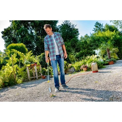 Der Gloria Unkrautbrenner Thermoflamm bio Professional Plus ist ein Abflammgerät, das für den Anschluss an eine externe Druckgasflasche konzipiert ist. Die im Lieferumfang enthaltene 5 m lange Schlauchleitung ermöglicht eine flexible Handhabung. Der leistungsstarke Flammstab ist ideal für den häufigen Einsatz auf großen Grundstücken geeignet. Dank einer Gesamtlänge von 94 cm ermöglicht der Thermoflamm bio Professional Plus ein bequemes Arbeiten im Stehen. Dies ist vor allem bei größeren Flächen und langen Arbeitsintervallen von Vorteil.